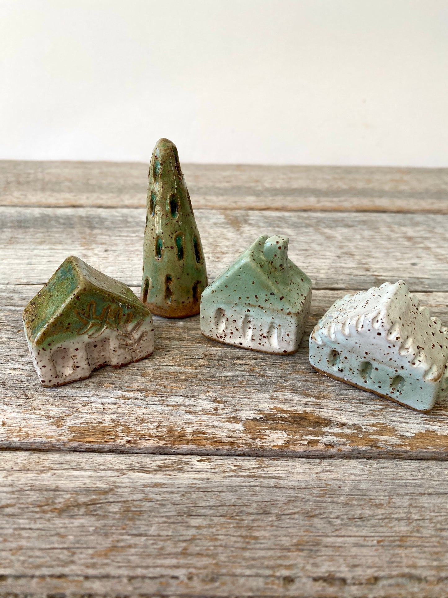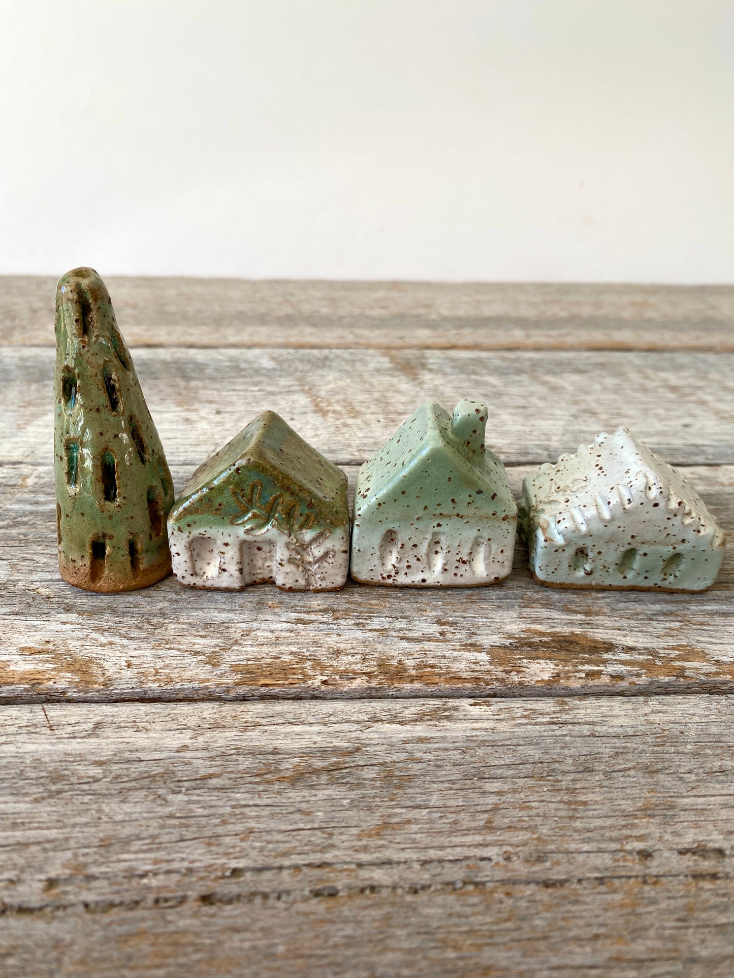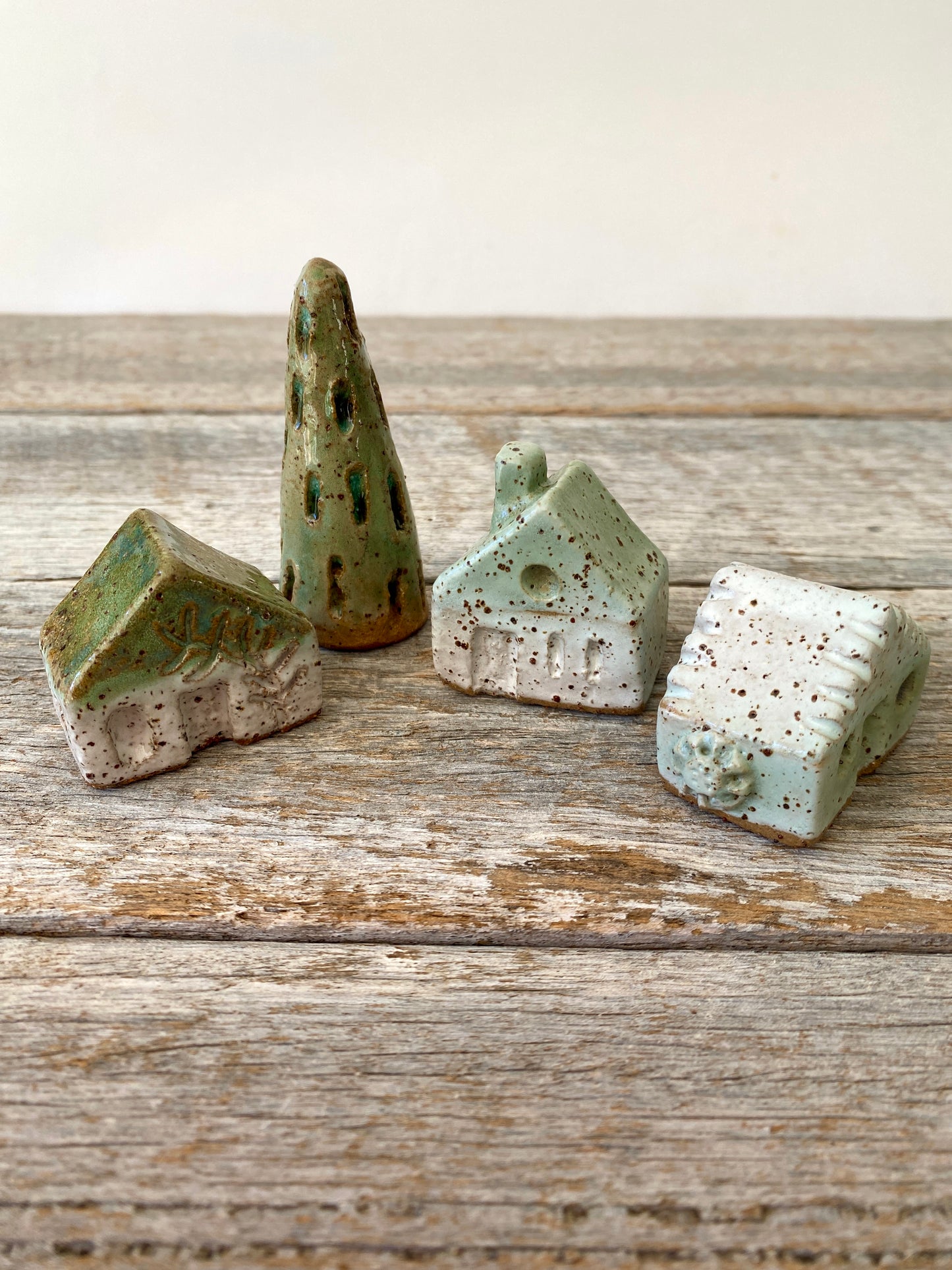These cute tiny cottages are made of rustic speckled Australian stoneware clay. Handmade in different sizes, shapes and colours - no two sets are the same. This listing is for a set of 3 tiny cottages and one cute tree glazed in white and green colours - as shown in the images.