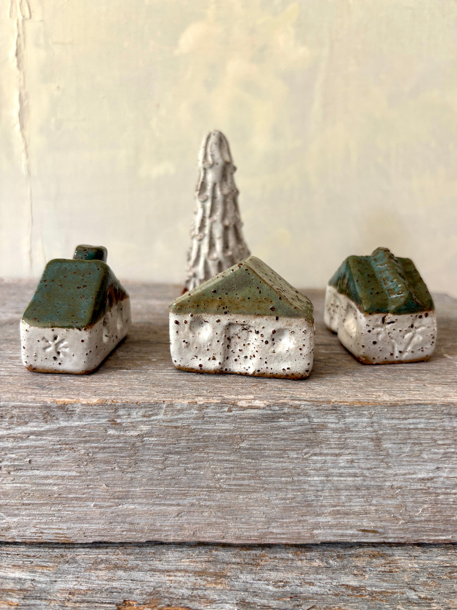 These cute tiny cottages are made of rustic speckled Australian stoneware clay. Handmade in different sizes, shapes and colours - no two sets are the same. This listing is for a set of 3 tiny cottages and one cute tree glazed in white and green colours - as shown in the images.