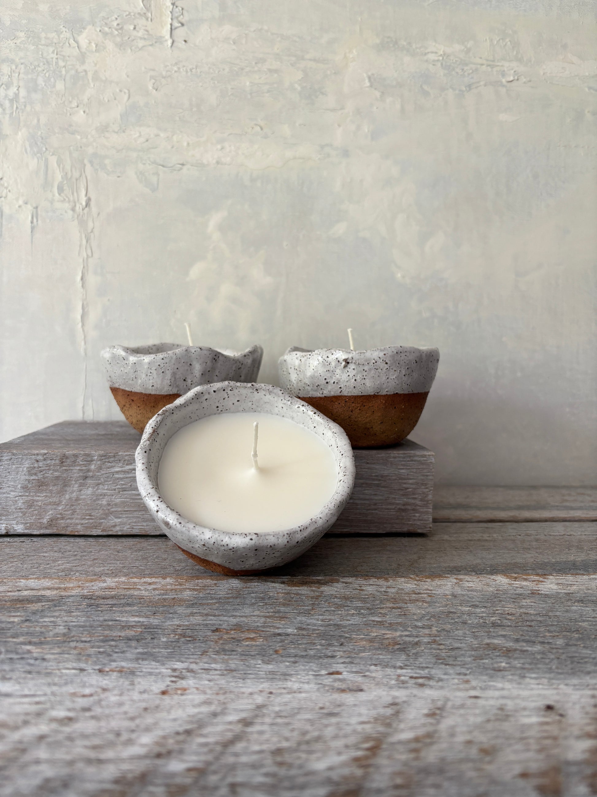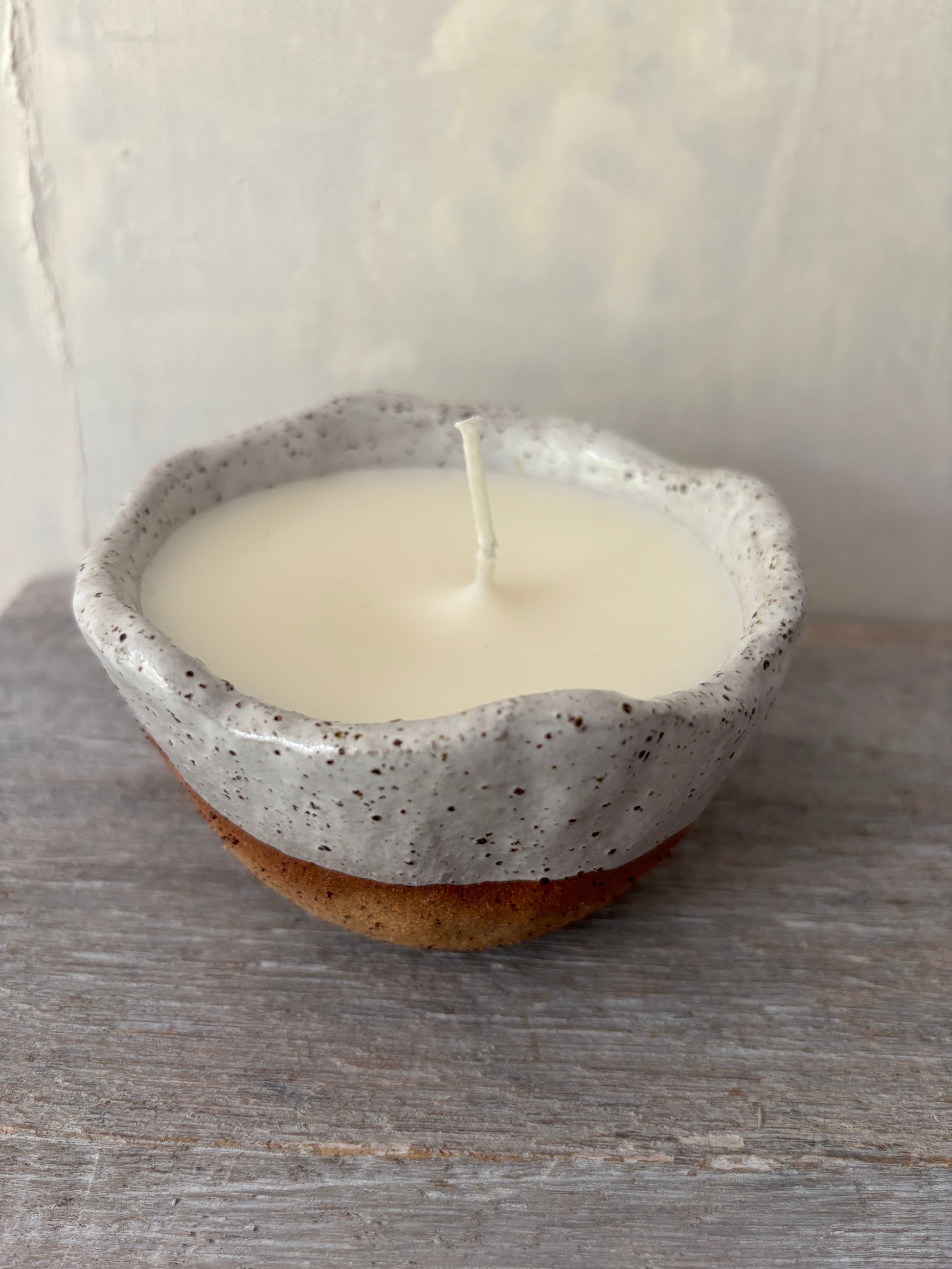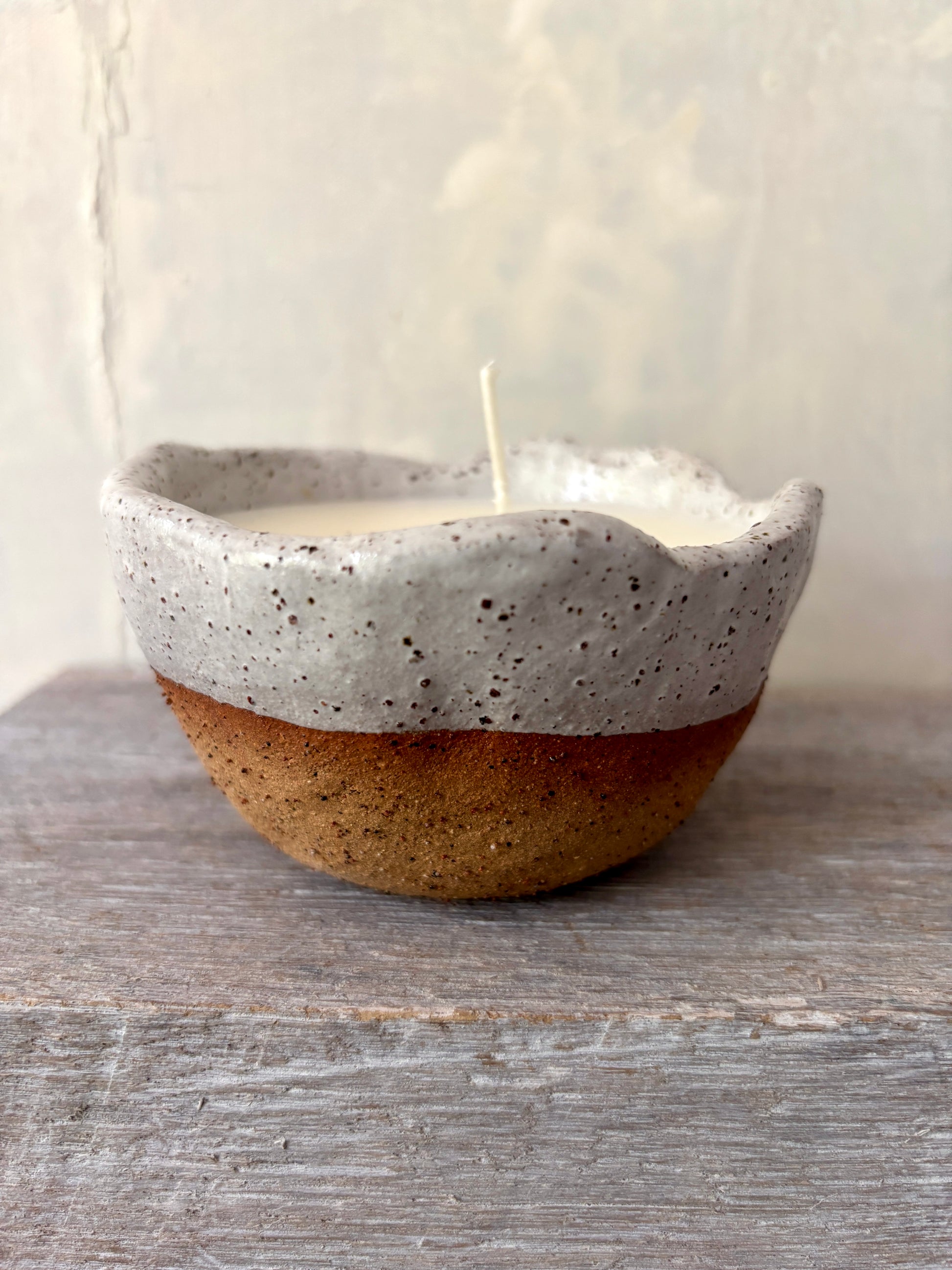 Beautiful reusable earthy ceramic bowl with uneven edge. After the candle burns down, just wash with boiling water and you will have a useable little bowl to re-use as a serving bowl, succulent pot or trinket jar.