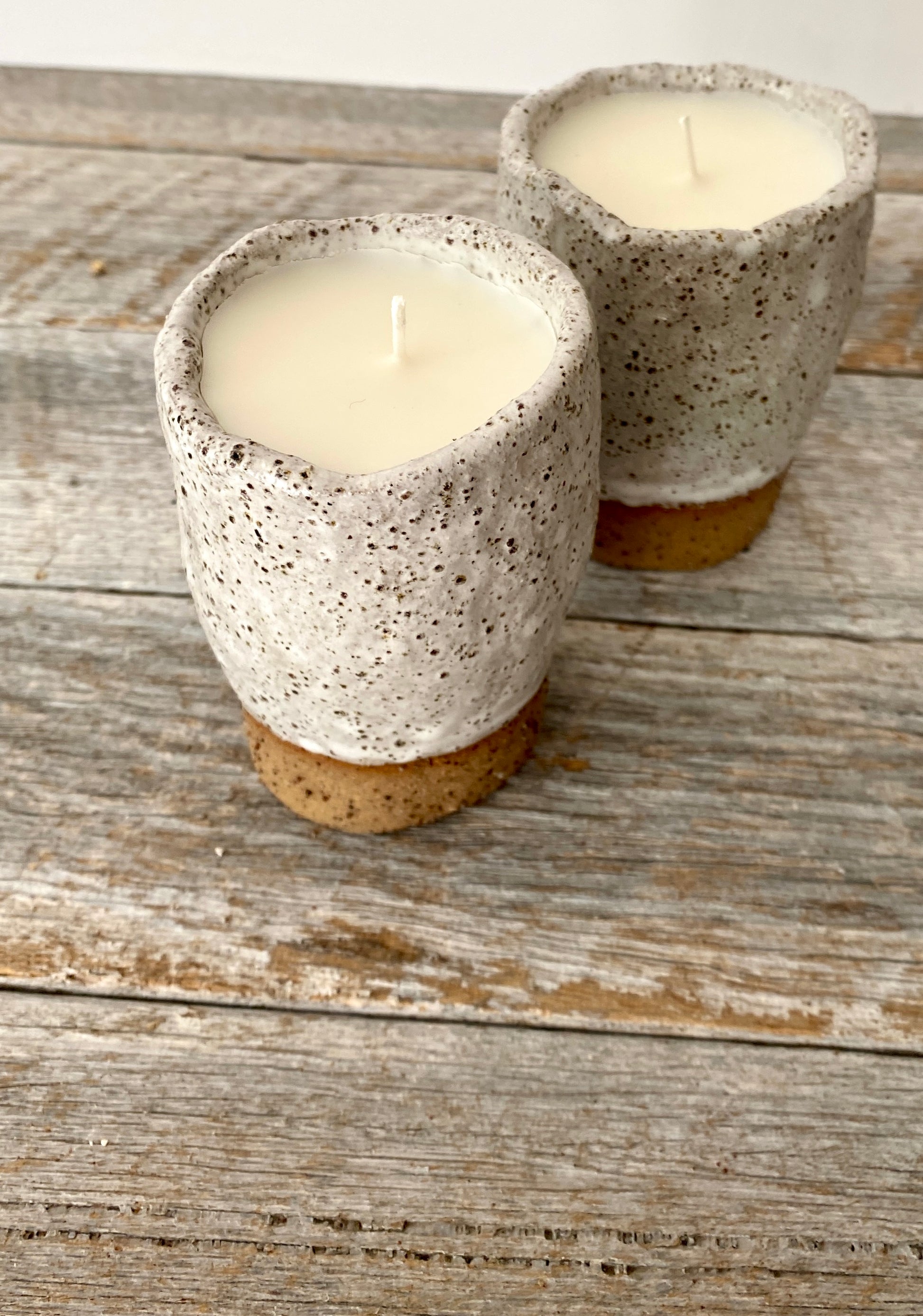 Hand poured non-scented white soy candle in a hand formed rustic white glazed vessel.