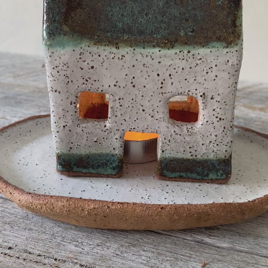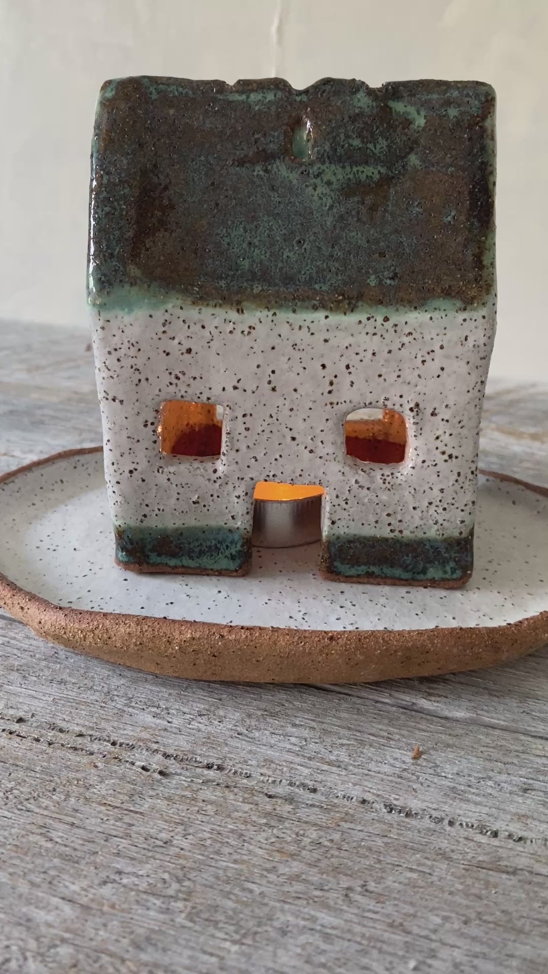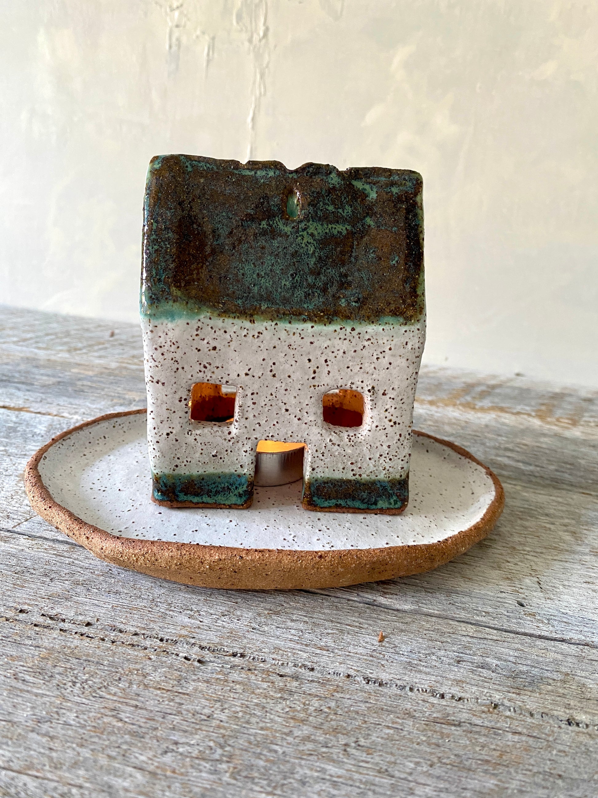 Hand-built ceramic cottage. Glazed inside and out in white, green and brown. Sits on an oval plate (17cm). The Cottage is 11cm high.