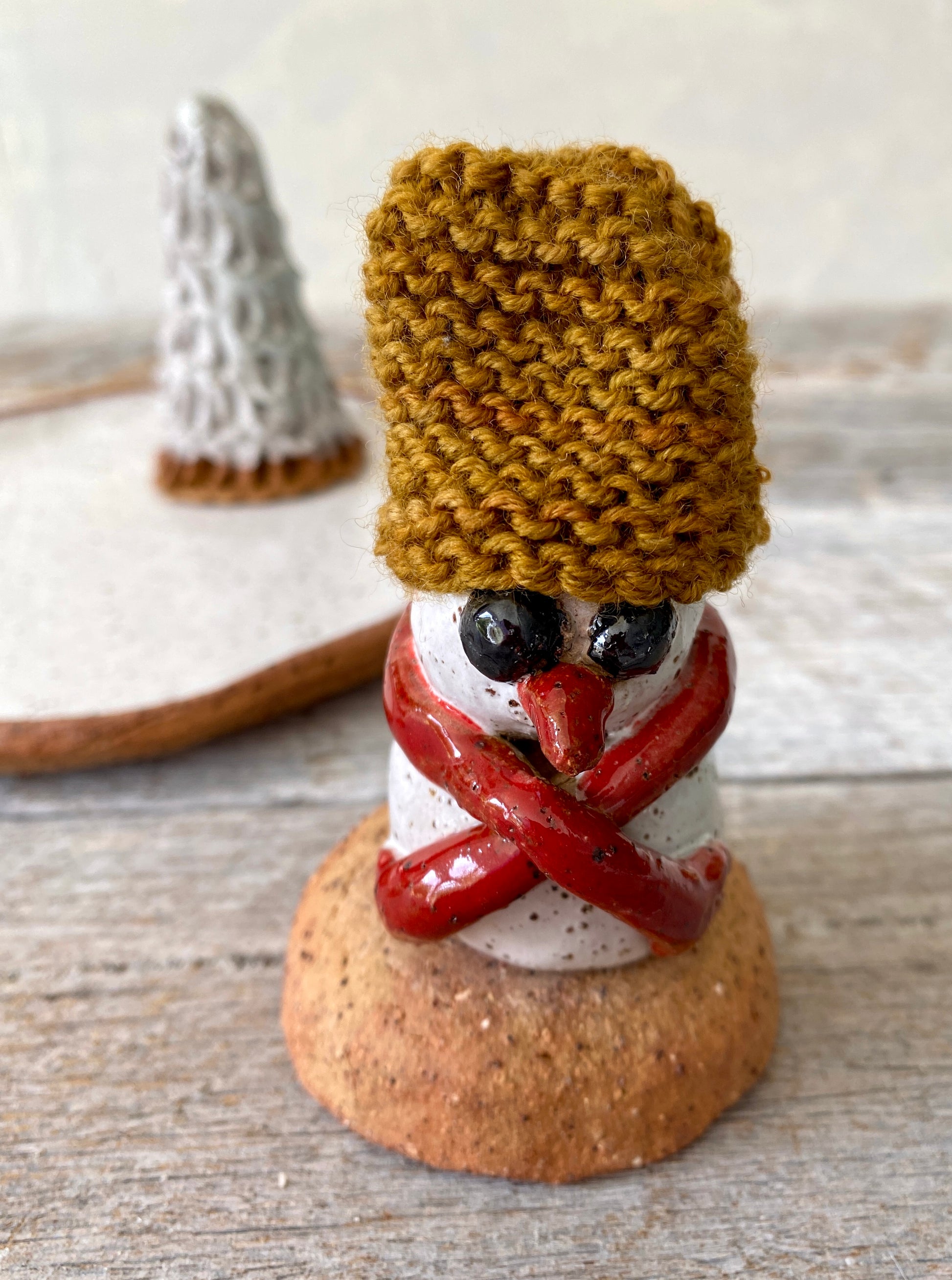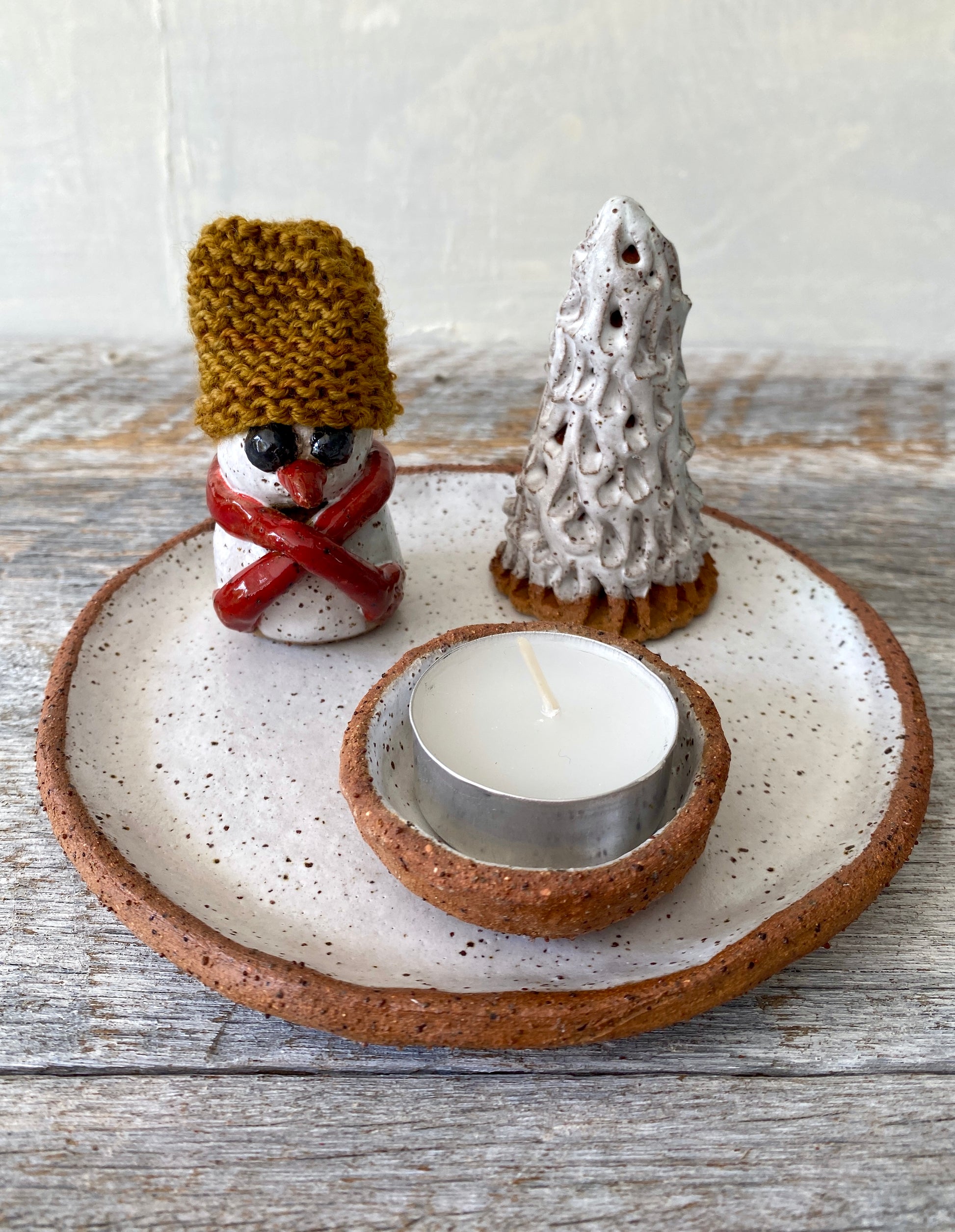 Bring festive cheer to your home with this charming handmade Christmas arrangement. Featuring a joyful snowman in a hand-knitted hat, a classic Christmas tree, and a glowing tealight candle, all nestled together on a decorative ceramic plate.
