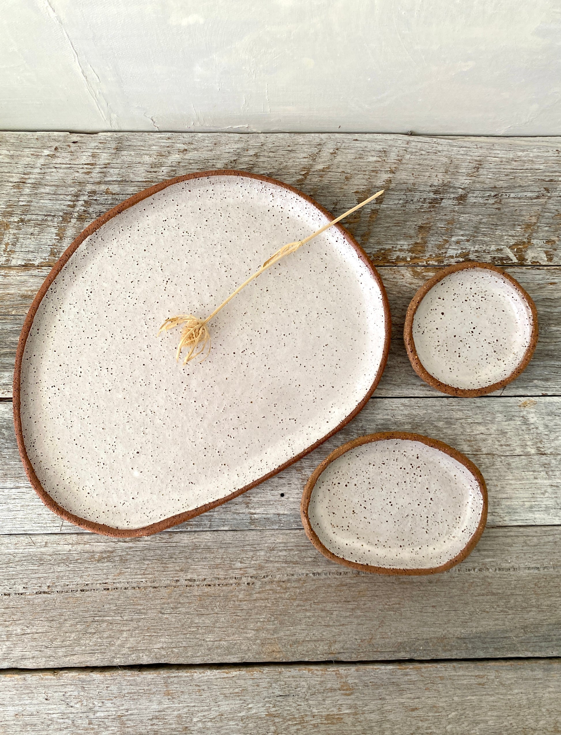 Hand formed and organically shaped this medium sized serving/dinner plate comes with two small dishes.